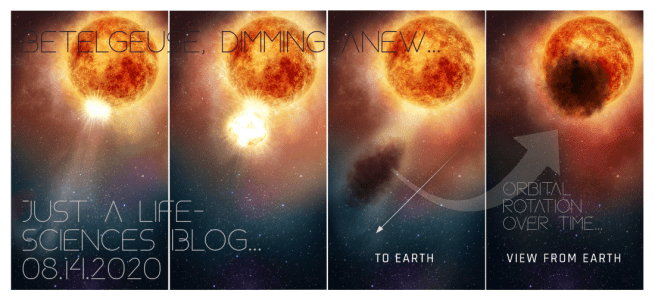 The first panel of four images, at right above is Betelgeuse. Loving this. . . simply loving it — for even as stars die, we know inexorably new ones. . . are ever being born. And, ultimately, all from the same primordial matter. Smile.